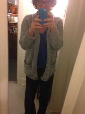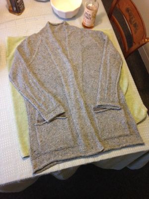 And here it is, blocking on the dining room table. The sleeves fit perfectly, but the body is a bit loose. Shouldn’t matter too much because it is an open cardigan, but depending on how it fits when it is dry, I might (gasp) toss it in the dryer to snug it up a bit. Stay tuned.