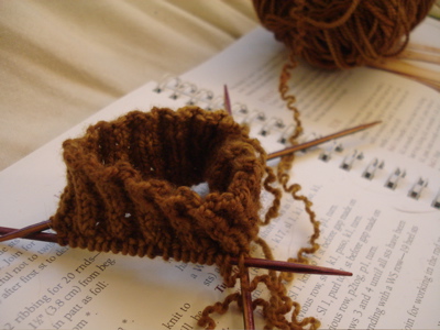 I knit less than five rows on this sock, and soon I’ll be ready to start decreasing for the toe. Ideally, I’ll finish the first sock this week, cast on the second and get through the ribbing before my first exam. That way I’ll have easy knitting handy to help with hard thinking.