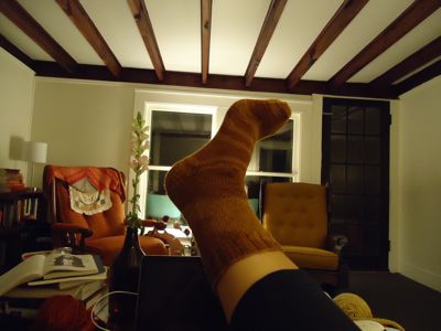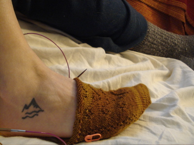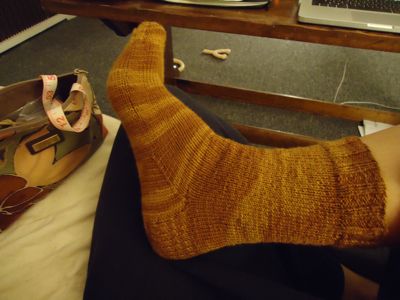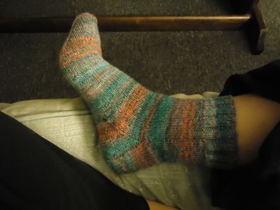 Old sock — an On-Hold sock-in-progress from Socks from the Toe Up, initially begun for the KAL. (Looks sort of okay here, but the foot is baggy. I could really see the size difference when I compared this sock-in-progress to the superbly-fitting emerald city gusset heel socks I just finished.)