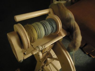 Motivated by the awesomeness of my handspun sock, I sat back down at my wheel. You know, to finish whatever I’ve been spinning so that I can get started on another 3-ply. For more socks. It is a vicious, vicious cycle. This is an in progress shot of the second bobbin of whatever delicious Hello Yarn Fiber Club fiber I was spinning. (I just looked — Finn in the Shaking Leaves colorway, from January 2011.)