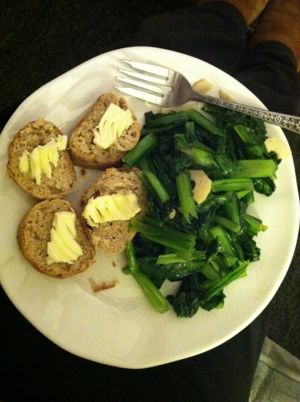 Last night I reheated one of the baguettes K. and I froze from our kitchen adventures this summer, and then cooked some komatsuna in olive oil, garlic, and red pepper flakes. And then I knit some more.