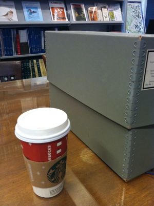 This might be my favorite picture from my trip, and fellow historians will understand why. I was looking at archival materials held in a place other than a formal archive — which meant I could keep my stuff nearby, and bring a latte to keep me company. Don’t worry — this picture is the closest that coffee ever came to that box of old stuff. After I snapped this picture, my lunch bag and my latte went to another table! I certainly understand why there are rules governing conduct in archives, and I am happy to follow them, as I like being able to look at stuff from a really long time ago. Days spent in archives, though, tend to be a little rough: I’m often strapped for time on these short research trips, and the rules mean I end up under-caffeinated, dehydrated, and hungry by the end of the day. It felt like a real treat to be able to fetch boxes myself, sip coffee at a safe distance from my materials, and interact with a wider range of people, by virtue of occupying space at a table in the middle of the office that was so kind to host me for a few days last week.