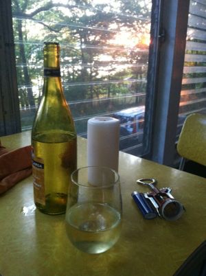 This is how I dealt with Saturday night’s power outage. Not a bad way to keep cool. (I was worried that this chardonnay was going to warm in my slightly-less-cool-by-the-second non-electrified fridge.) The power was out for about three hours, and I was able to get some grading done as the sun set.