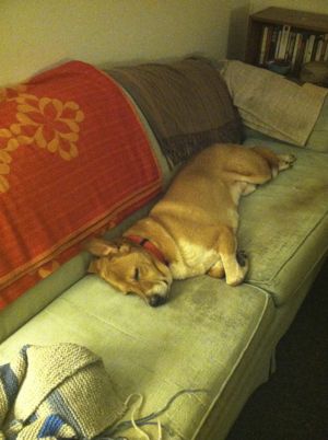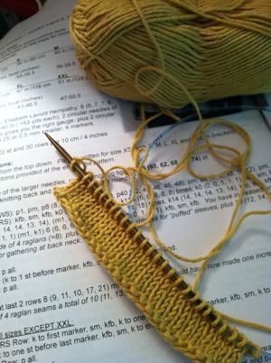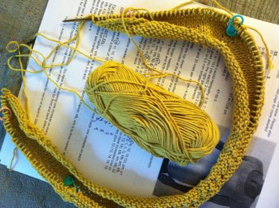 Yesterday morning, I swatched for Buttercup with my coffee. I bought the yarn for this three summers ago, when I was back in the southwest the summer after my first year of grad school. It’s Queensland Cotolino, and I’ve got 8 balls of it. 8 balls x 105 meters = roughly the amount required for the XS size. Good thing I’m not working on a Ph.D. in math…