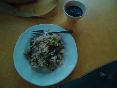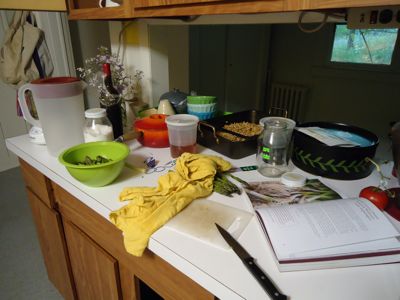 And last night, I made a big batch of Heidi’s Millet Fried Rice, from Super Natural Cooking. I’d forgotten how much I like millet — and how much I like this recipe. Basically, you cook the millet, and when that’s almost done, you make a super thin egg pancake, by melting butter with some toasted sesame oil in a large pan, beating a couple of eggs as if to make an omelette, and then pouring in the egg. You swirl the eggs around to get a really thin layer, and then fold the eggs over on themselves once they are cooked enough to let you do that. Shortly after that, you remove the egg from the pan, and then stirfry whatever veggies you’re using in a super hot pan, and then you add the millet, some soy sauce, and then you slice the egg pancake into strips and add that, too. I topped mine with onion sprouts and some canned roasted red pepper, both from my spring CSA box. I might have eaten this for lunch and dinner today, too.