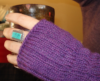 Last night, after taking way too long to read a relatively short book, I was itching to have that great feeling that comes with crossing a long-overdue task off of my list. Out came my thanksgiving day mitts: knit three years ago in a purple-y shade of Cascade 220, these were my go-to mitts until Boh managed to attack one of them in fall 2008 or winter 2009. Since then, they’ve sat patiently on top of a bowl of yarn odds and ends, waiting to be mended. And yesterday was the day. I dug out my very special set of knitting needles (from a woman I think of as an honorary grandmother) in order to find a set of size 5 dpns. (So great to be able to look up what needles I used on ravelry!)