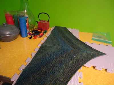 As you can see, I’ve been knitting away on the textured shawl this week. And last night, after a lovely late night beer and knitting date, I realized that I was getting very close to the end of my handspun. This morning, with my coffee, I knit a few more rows, and then gambled (poorly) about whether I’d have enough to bind off on the right side. This is a photo of the gamble, alongside my proposed solution. (Remember the sweater I frogged awhile back?) I made it halfway through the bind-off row when I ran out. Luckily, even though the Rowan Felted Tweed stands out against the backdrop of the textured shawl in this photo, one strand, on the edge of half the shawl, blends right in. I spit-spliced and continued binding off, and then raced against the clock to soak the shawl and pin it out before power-walking to campus to teach section this morning.