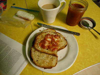 Friday morning, tomato jam and goat cheese on toast. This was exactly what I needed to start the last day of the (school) week. The jam is very sweet at first, and then the flavors smooth out a bit and there is a nice kick (from the chili flakes) at the end of a bite. I was concerned about the consistency of the jam — seemed a bit loose to me — but this was well within the range of the jam category, though I spread it with a spoon instead of a knife. I’ve been reading a bunch of food blogs that focus on preserving, and I’ve seen some discussion about how flavors mellow and meld as canned food sits on the shelf. Or in the fridge. This makes sense — the last jar of my summer 2009 dilly beans were different than the earlier jars. And some meals that are just alright as dinner are incredible as leftovers.