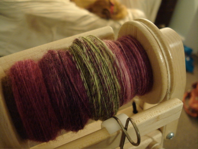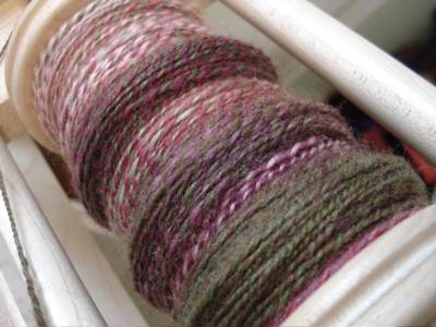 This morning, I started plying the two bobbins together, and snapped a few photos part of the way through. This looks to me like it is going to be fingering weight rather than laceweight yarn when it is all plyed and soaked, and I’m thinking it might make a lovely shawl. (That will not be for me to decide, however, as this skein is intended as a gift for a knitter!)
