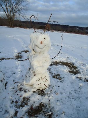 On Tuesday afternoon, inspired by a recent clip from Jimmy Fallon’s late night show (where he and his guests built snowmen on the roof and then tackled them), several of us gathered in a local park with the same concept in mind. (The whole afternoon was my friend M.’s idea. Brilliant.) Here is my jackalope snowman. In this image, he has both arms, though I had to keep replacing his right arm because every time I turned around, Boh was gnawing on it.