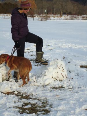 When it came time for the destruction part, Boh was not helpful. My friends were able to jump on their snowmen. Boh, on the other hand, came to a full stop just in front of the jackalope, so I had to settle for pushing ours over. Here’s a shot of Boh in full retreat: